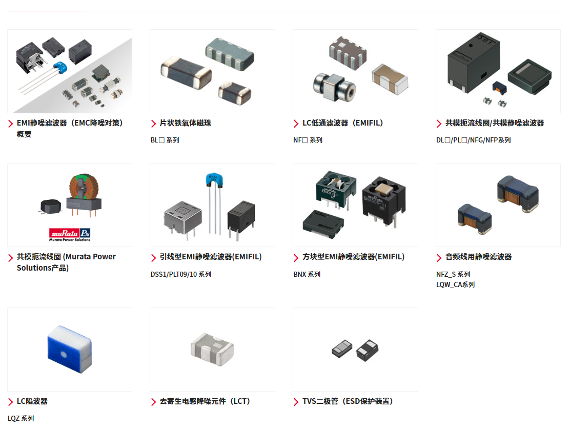 村田的靜噪元件中備有能夠根據多種方法采取靜噪措施的零件,其中包括可有效消除噪音的小型EMI靜噪濾波器、降低在電容器內部和基板產生的ESL并大幅遏制高頻帶噪音的去寄生電感降噪元件(LCT)以及可保護半導體免受外部靜電影響的TVS二極管。 請參閱EMI基礎講座等靜噪對策的各種介紹。